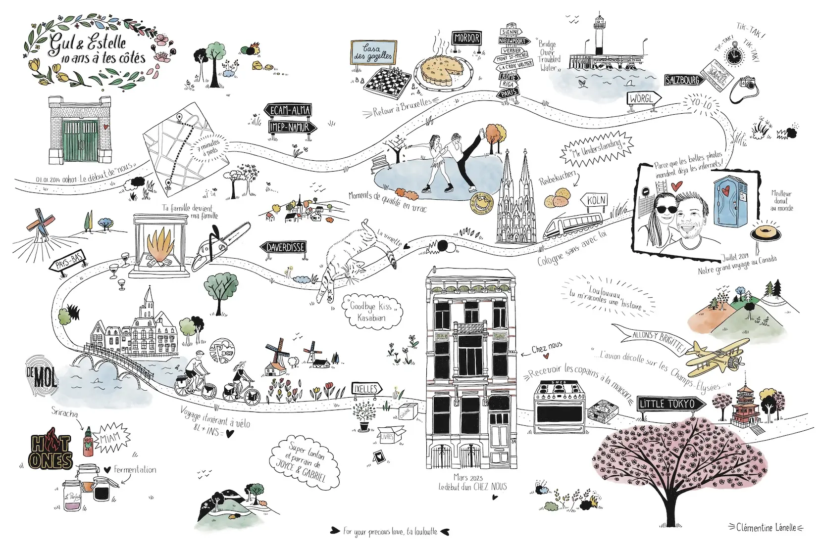 Graphiste et illustratrice, j’accompagne particuliers, associations et entreprises dans la mise en image de leurs projets. De la création de faire-parts et d’invitations aux illustrations, couvertures de magazines, identités visuelles, fresques murales ou vitrines illustrées, chaque projet est pensé comme une collaboration.